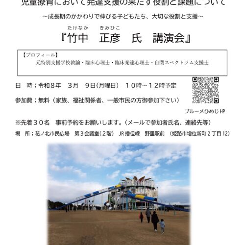 活動報告 お知らせ 2026年2月2日 竹中正彦氏 講演会の開催 お知らせ 2025年11月28日 親子で楽しむブルーメの日 お知らせ 2025年11月28日 子育て・発達の「おしゃべりカフェ」開催 お知らせ 2025年4月27日 児童発達支援事業 新着情報一覧